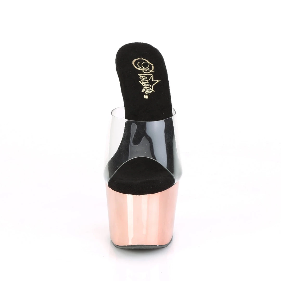 | 7″ (17.8cm) Stiletto Heel, 2 3/4″ (7cm) Platform Slide with Chrome Plated Bottom |