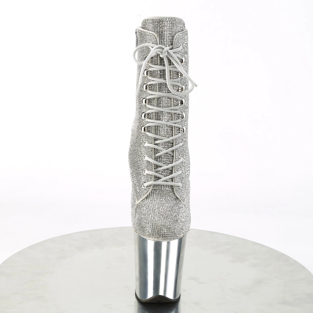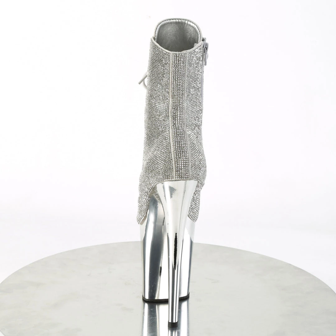 PLEASER FLAMINGO-1020CHRS SILVER RHINESTONE CHROME PLATED 8 INCH HIGH HEEL ANKLE BOOTS SIZE 8