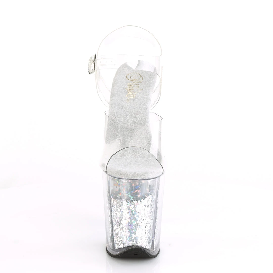 | 8″ (200mm) Heel, 4″ (100mm) Platform Ankle Strap Sandal w/ Holographic Glitter Filled Platform |