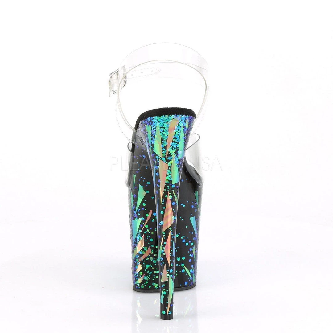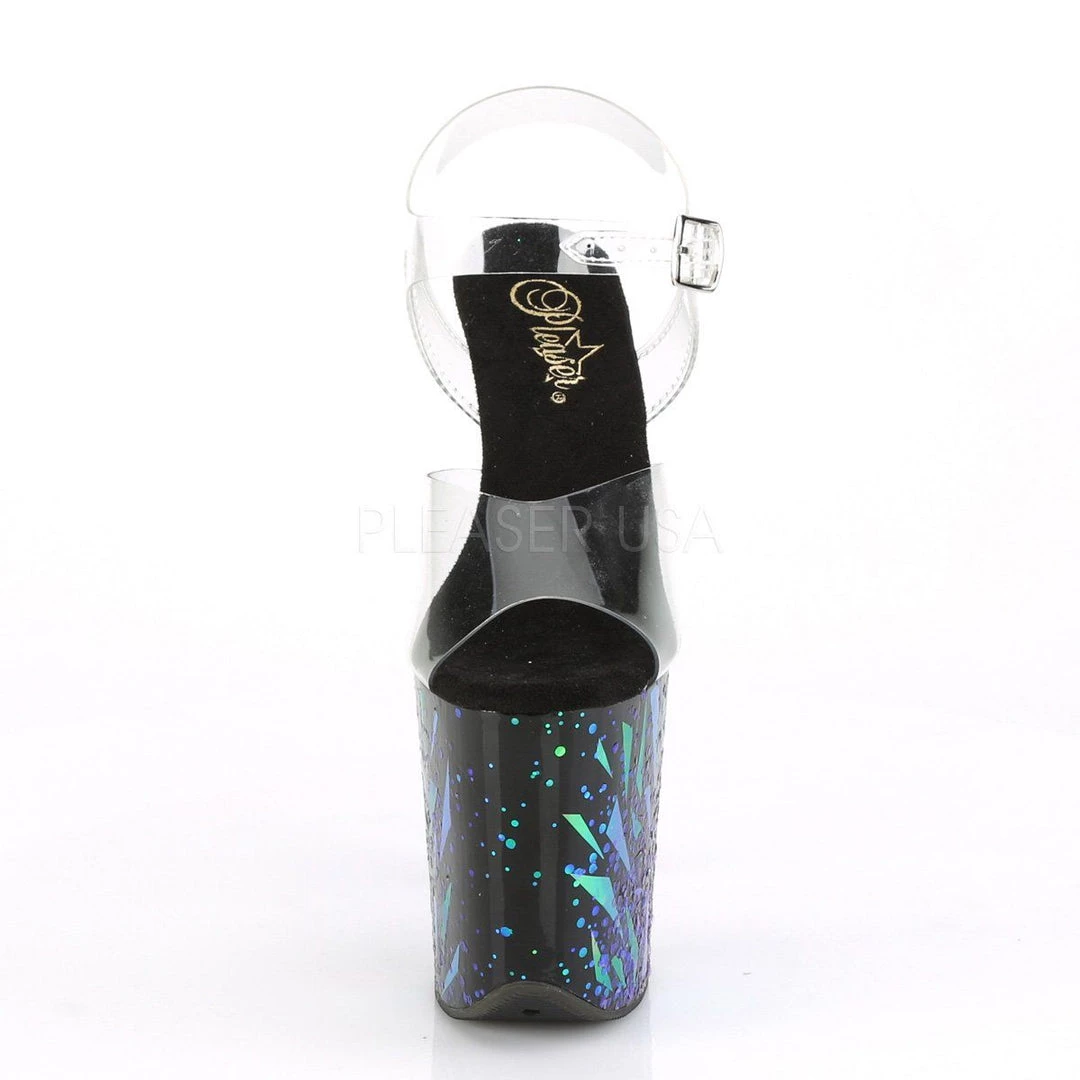 | 8″ (200mm) Heel, 4″ (100mm) Platform Ankle Strap Sandal Featuring Holographic Geometric Shape Splash Effect on the Platform Bottom |