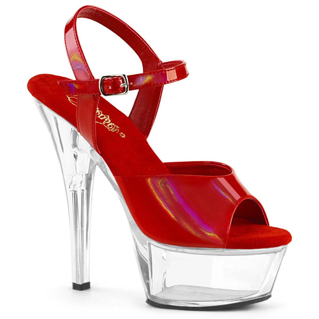 6″ (152mm) Heel, 1 3/4″ (45mm) Clear Platform with Ankle Strap Featuring a Red Brushed Holographic Upper.