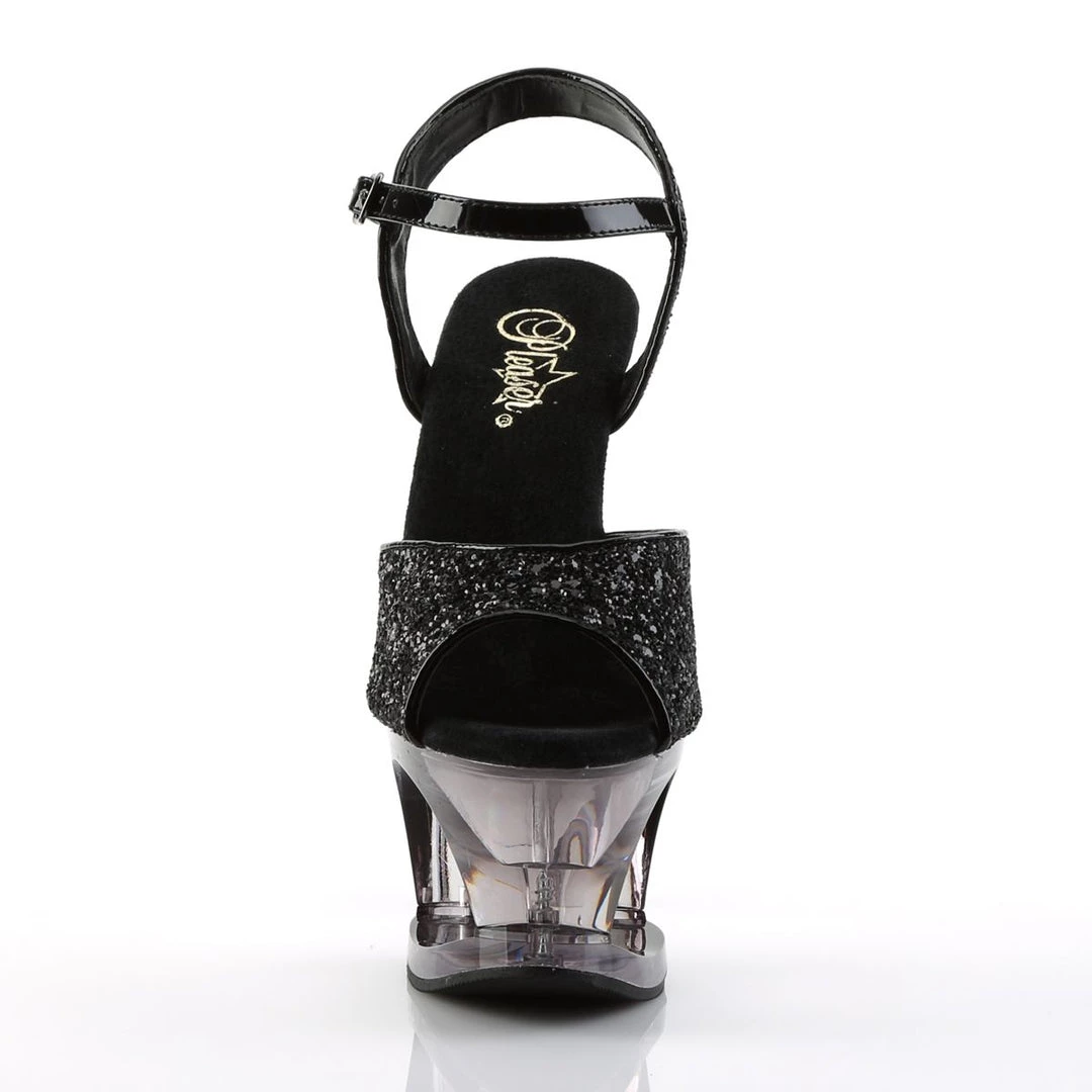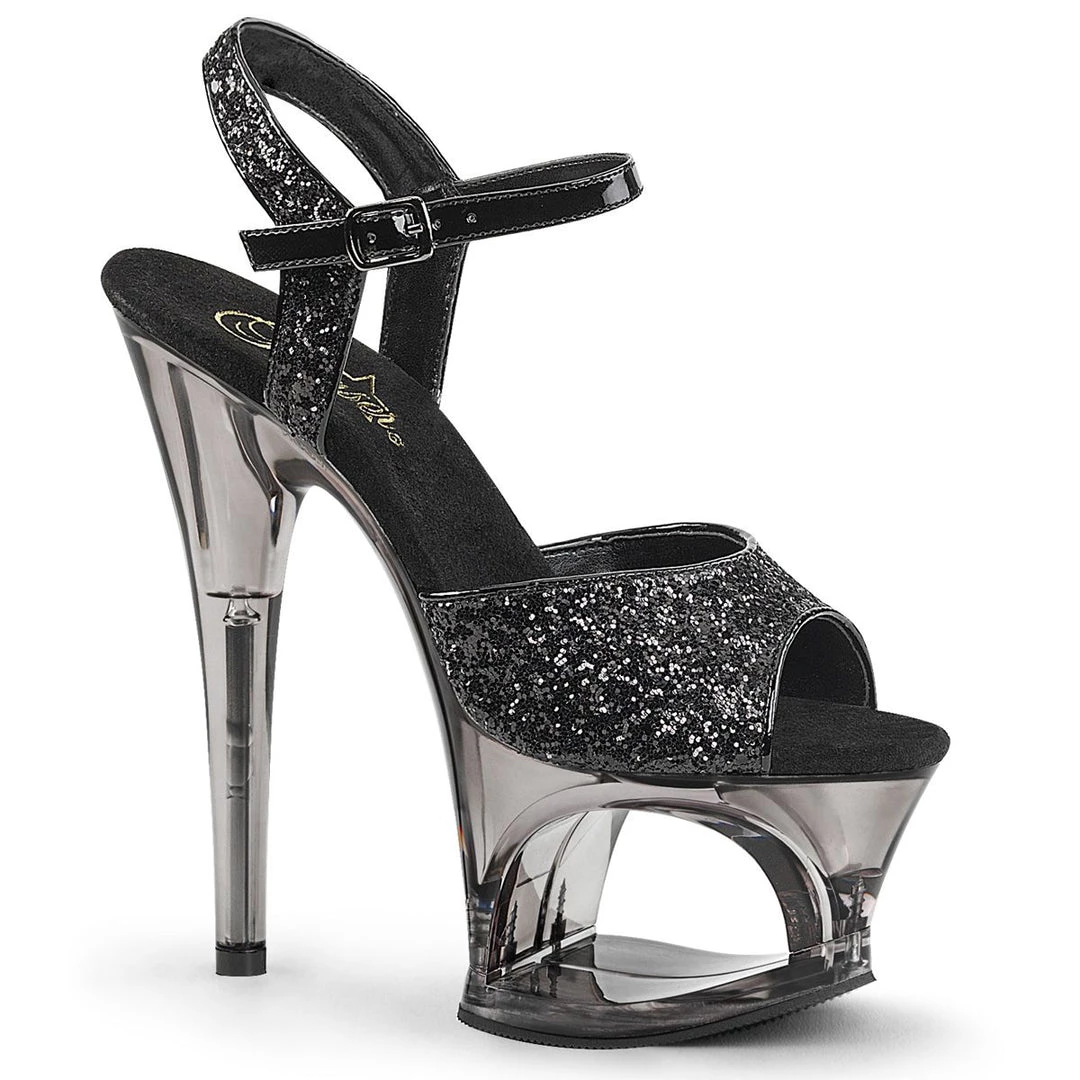 | 7″ (17.8cm) Heel, 2 3/4″ (7cm) Cut-Out Tinted Platform Ankle Strap Sandal with Glitter Upper |
